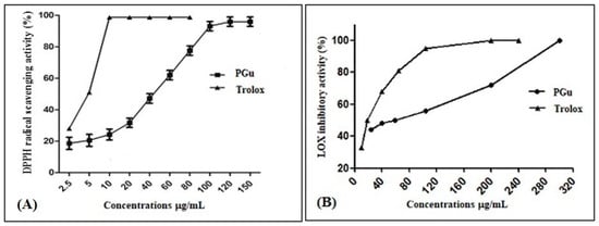 This was determined by applying the lipoxygenase inhibition assay, where PGu revealed promising anti-inflammatory activity, with an IC50 value of 59.05 ± 0.5 µg/mL relative to Trolox, which displayed an IC50 of 18.5 ± 0.5 µg/mL (Figure 2B).