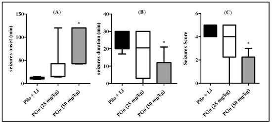 Effects of PGu on pilocarpine + lithium-induced seizures in rats on seizure onset (A), seizure duration (B) and seizure score (C). LiCl was injected i.p. in a dose of 3 mEq/kg b.w. After 24 h, the animals were injected with pilocarpine hydrochloride in a dose of 30 mg/kg b.w. PGu was given in doses 25 and 50 mg/kg twice and the second dose was given 1 h before piloarpine. Data are presented as median (25th, 75th percentile) and analyzed by Kruskal–Wallis and Dunn’s as a post-hoc test. The superscript * indicates significance in relation to the pilocarpine + lithium-treated group at p < 0.05.