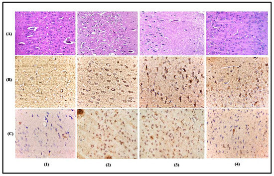 Tissue sections of a 4-µm thickness were deparaffinized using xylene, then dehydrated using alcohol and heated for 5 min in citrate buffer to retrieve antigen. Then, the manufacturer’s protocol was used to conduct immunohistochemistry staining. Basically, cyclooxygenase-2 (COX-2) monoclonal antibody (Thermo Fisher Scientific, Hemel Hempstead UK, Catalog number RB-9072-P) or iNOS (inducible nitric oxide synthase) (Thermo Fisher Scientific, Hemel Hempstead, UK, Catalog number: RB-9242-R7) or mouse anti-human GFAP (Glial fibrillary acidic protein) (Thermo Fisher Scientific, Hemel Hempstead UK) were incubated separately with the deparaffinized tissue sections after being treated for 20 min with 0.03% H2O2. The slides were washed by TBS (Tris-Hcl Buffered Saline) and then incubated with the secondary antibody that corresponded to the antigen then the slides were washed again with TBS and kept for 10 min in 0.02% diaminobenzidine (DAB) with 0.01% H2O2. The slides were counterstained with hematoxylin and examined by a light microscope. Image analysis software (Image J, 1.48a, NIH, Rockville, Maryland, USA) was used for immunohistochemical quantitation of antibodies. For each section, determination of the optical density of stained positive cells was done through 10 different fields.