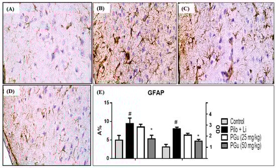 Immunohistochemical staining was used to assess the expression levels of the inflammatory biomarkers COX-2 and iNOS in the cerebral neurons. The control group displayed a reduced level of immunostaining for both markers; meanwhile, pilocarpine-treated animals showed significant elevation in both COX-2 and iNOS by an estimated 108% and 79%, respectively, in its assessed optical density (OD) and 131% and 269%, respectively, in the area percent of stained cells (A%) compared to the control group. PGu in a dose of 25 mg/kg b.w. insignificantly reduced the elevated COX-2 and iNOS expression by 15% and 17%, respectively, as expressed by the OD and 19% and 16%, respectively, as expressed in A%. In contrast, pretreatment with PGu in a dose of 50 mg/kg b.w. significantly declined the elevated COX-2 by 40% and insignificantly decreased iNOS expression by 18% as expressed by OD and significantly reduced the A% of both COX-2 and iNOS stained cells by 46% and 77%, respectively. The immunohistochemical staining was determined via quantitative assessment of the optical density of the stained areas using the image analysis software and is represented in Figure 4B,C and Figure 5. Additionally, to better explain the potential effect of PGu on glial cells, immunohistochemical staining of the astrocyte-specific protein, glial fibrillary acid protein (GFAP), the marker of astrocytosis, was assessed (Figure 6). Pilocarpine significantly elevated the expression of GFAP compared to the control group, estimated by 1.6-fold and 91% in its assessed OD and A%, respectively. However, PGu at a dose of 25 mg/kg b.w. substantially reduced the elevated GFAP expression by 25% and 9.5%, respectively, as expressed by the OD and A%, respectively, relative to the Li/pilocarpine-treated group. In contrast, at 50 mg/kg b.w., PGu effectively declined the elevated GFAP expression as evidenced by its faint immunoreactivity, as revealed in Figure 7, estimated by 41% and 37% as expressed by the OD and A%, respectively, with respect to the Li/pilocarpine-treated group.