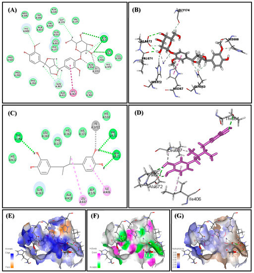 2-D (A) and 3-D (B) binding modes of PGu and 2-D (C) and 3-D (D) binding modes of nordihydroguaiaretic in 5-lipoxygenase (5-LOX) active sites and the presence of PGu in the active pocket of the receptor showing the aromatic regions (E), regions of hydrogen bond formation (F), as well as hydrophobicity regions (G) in 5-LOX.