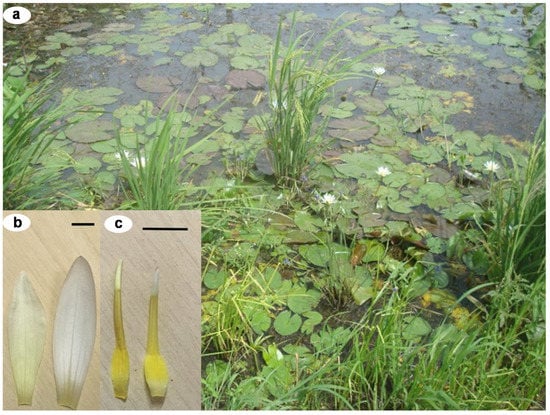 - Mohamed, Z.A.; Serag, M.S. Ecology and anatomy of Nymphaea Lotus L. in the Nile delta. J. Environ. Sci. 2003, 26, 1–20. [Google Scholar]