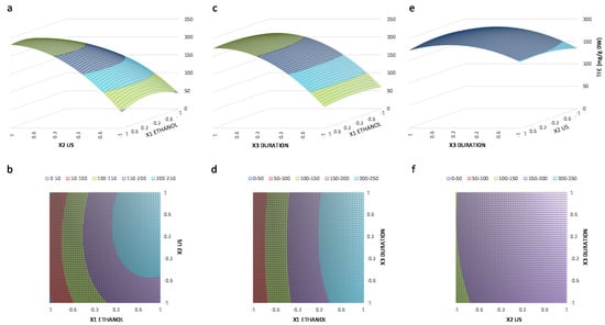 Three-dimensional (3D) surface response and two-dimensional (2D) contour plots, respectively, from the model predicted TFC (in mg/g DW) extracted from mature N. lotus stamens as a function of aqEtOH concentration and US frequency. (a,b), aqEtOH concentration and extraction duration (c,d) and US frequency and extraction duration (e,f).