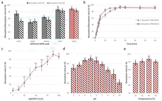 After the screening phase, the XAD-8 MPR was selected for further optimization experiments. Optimal absorption and desorption times were determined as described above with different incubation durations (0–60 min) for absorption and then for desorption. The concentration of the aqEtOH solution (0–100 (v/v)) as well as the desorption incubation temperature (25–55 °C) were also evaluation using the optimal absorption incubation time of 25 min and the optimal desorption incubation time of 15 min. Using 1 M HCl and 1 M NaOH solutions, the desorption solution pH was adapted to different values (2–10) to evaluate the influence of the pH value on purification capacity of XAD-8 MPR.