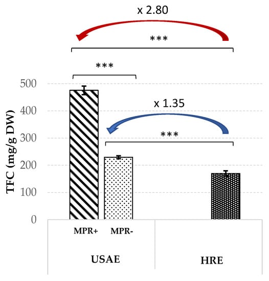 To evaluate the efficacy of the proposed protocol, TFC obtained from N. lotus stamens using optimized UAE alone (UAE MPR−) or coupled with the proposed MPR purification step (UAE MPR+) was compared to the conventional HRE method. For this purpose, HRE was performed using the same aqEtOH concentration of 90% (v/v), extraction duration of 46 min, temperature of 45 °C and L/S ratio of 25:1 mL/g as for the optimized UAE (the only difference is the absence of a request from the US). The results of these extraction protocols are shown in Figure 4.