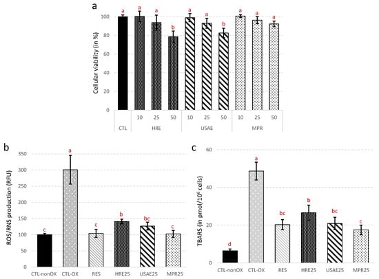 Effects of the different extracts from N. lotus stamen on yeast cell viability estimated at different extract concentrations (10, 25 or 50 µg/mL) (a), ROS/RNS production in response to UV-induced oxidative stress (b) and TBARS production in response to UV-induced oxidative stress (c). CTL-nonOX are control yeast cells; CTL-OX are control yeast cells subjected to UV-induced oxidative stress; RES are yeast cells subjected to UV-induced oxidative stress in presence of resveratrol (positive antioxidant control, 10 µM); HRE25 are yeast cells subjected to UV-induced oxidative stress in presence of 25 µg/mL of N. lotus extract obtained by HRE; UAE are yeast cells subjected to UV-induced oxidative stress in presence of 25 µg/mL of N. lotus extract obtained by UAE; MPR are yeast cells subjected to UV-induced oxidative stress in presence of 25 µg/mL of N. lotus extract obtained by UAE followed by DAX-8 MPR purification step. Values are means ± SD of three independent experiments. Different letters represent significant differences between the various extraction conditions (p < 0.05).