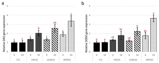 Effects of the different extracts from N. lotus stamen on SIR2 (a) and SOD2 (b) gene expression determined by RT-qPCR. Expression was normalized with TUB1 gene. CTL are control (untreated, DMSO addition) yeast cells; HRE25 are yeast cells subjected to UV-induced oxidative stress in presence of 25 µg/mL of N. lotus extract obtained by HRE; UAE are yeast cells subjected to UV-induced oxidative stress in presence of 25 µg/mL of N. lotus extract obtained by UAE; MPR are yeast cells subjected to UV-induced oxidative stress in presence of 25 µg/mL of N. lotus extract obtained by UAE followed by DAX-8 MPR purification step. Values are means ± SD of three independent experiments. Different letters represent significant differences between the various extraction conditions (p < 0.05).