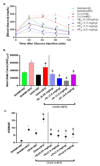 Effect of ovariectomy (OVX), 17β-Estradiol (E2) and Progesterone (P4) on glucose tolerance and insulin sensitivity in high-fat diet (HFD) fed mice. (A,B) Intraperitoneal glucose tolerance test (IPGTT) and area under curve (AUCIPGTT); (C) homeostatic model of insulin resistance (HOMA-IR) plot was calculated using the following formula: fasting blood glucose (mg/dL) × fasting plasma insulin (μU/mL)/405. Data were analyzed using one-way ANOVA by using graph pad prism software. Values are means ± S.E.M. for n = 6 mice. * p < 0.05, significantly different from normal diet-fed sham-operated (SHAM+ND) mice. # p < 0.05, significantly different from normal diet-fed ovariectomized (OVX+ND) mice. $ p < 0.05, significantly different from high-fat diet-fed OVX (OVX+HFD) mice.