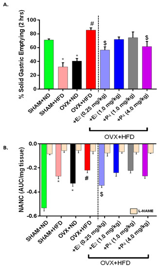 Effect of ovariectomy (OVX), 17β-Estradiol (E2), and Progesterone (P4) on (A,B) 2 h solid gastric emptying and gastric antrum nitrergic relaxation in HFD fed mice. Full and empty stomach weights were recorded; the difference estimated the remaining gastric content (GC) after 2 h of fasting. The rate of gastric emptying (GE) was measured with the equation of 1- [(Gastric Content /Food Intake) × 100. Nitrergic relaxation was measured in gastric antrum circular muscle strips at 2 Hz in an organ bath under physiological conditions. The nitric oxide (NO) dependence of the non-adrenergic non-cholinergic relaxation (NANC) relaxations was confirmed by preincubation (30 min) with the NO inhibitor nitro-L-arginine methyl ester (L-NAME; 100 μM). Area under the curve for is presented. Data were analyzed using one-way ANOVA by using graph pad prism software. Data are means ± SEM (n = 6). * p < 0.05, significantly different from normal diet-fed sham-operated (SHAM+ND) mice. # p < 0.05, significantly different from normal diet-fed ovariectomized (OVX+ND) mice. $ p < 0.05, significantly different from high-fat diet-fed OVX (OVX+HFD) mice.