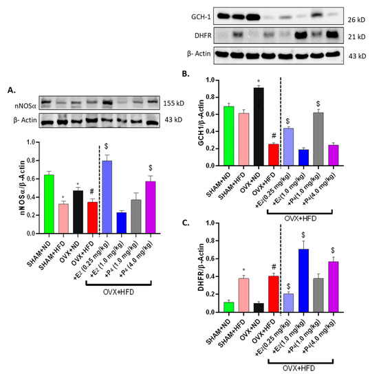 Effect of 17β-Estradiol (E2) and Progesterone (P4) on gastric neuronal nitric oxide synthase (nNOSα), GCH-1, and DHFR expressions in HFD-fed OVX mice. Representative immunoblot and densitometry analysis data for (A) nNOS α, (B) GCH-1, and (C) DHFR protein expression. Stripped blots were re-probed with β-actin. Data were normalized with housekeeping protein (β-actin). Bar graphs showed a ratio of target gene or protein with β-actin. Data were analyzed using one-way ANOVA by using graph pad prism software. Data are means ± SEM (n = 6). * p < 0.05, significantly different from normal diet-fed sham-operated (SHAM+ND) mice. # p < 0.05, significantly different from normal diet-fed ovariectomized (OVX+ND) mice. $ p < 0.05, significantly different from high-fat diet-fed OVX (OVX+HFD) mice.