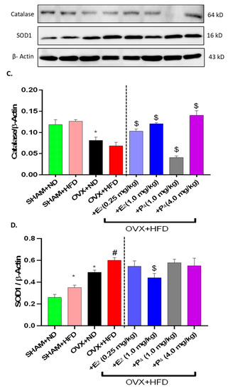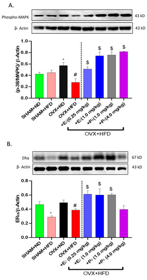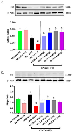 Activated MAPK expression levels were examined, as hyperglycemia and estradiol are known to influence the activation of MAPK and intracellular pathways [17,45]. Here, we observed a significant (p < 0.05) decrease in MAPK expression with chronic OVX but not HFD in Sham mice. Similarly, MAPK was upregulated in HFD-fed OVX mice (Figure 4A). E2 and P4 treatment exacerbated the upregulation in OVX+HFD groups. Moreover, representative western blots of ERα and ERβ levels in OVX mice following HFD feeding are presented in Figure 4B,C. Our data indicate that HFD feeding is associated with a depletion in sex hormone receptors as compared to ND-fed mice. Furthermore, OVX+ND mice displayed a decreased expression of ER that was significantly depleted in OVX+HFD groups. Sex hormones, both E2 and P4, improved ER and PR expression (Figure 4B–D).