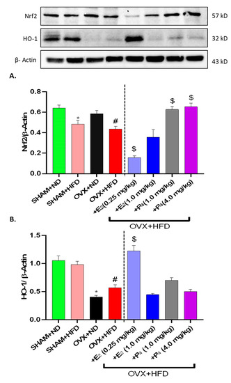 3.8. E2 and P4 Regulate Nrf2 and Phase II Antioxidant Enzymes Expression in OVX+HFD Mice