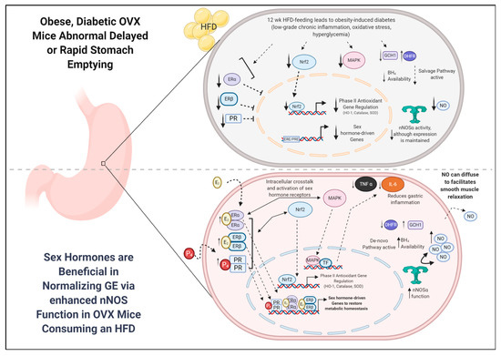 Schematic illustration depicting the hypothesized effects of 17β-Estradiol (E2) and Progesterone (P4) on mechanistic signaling of Sex hormone receptors on Nrf2, MAPK, and nNOS mediated gastric motility and gastric emptying in obesity/T2D female mice. We speculate that the sex hormone-depleted (OVX) gastric milieu may exhibit compensatory mechanisms to facilitate faster GI motility when consuming a daily HFD. Perhaps a gastrointestinal (GI) system devoid of ovarian sex hormones (chronic OVX) displays gradual changes in ER, Nrf2, and MAPK signaling in the gastric smooth muscle and enteric neurons to possibly “rewire” the female gut. The supplementation of sex hormones, E2 and P4, restored not only systemic and gastric fitness through restoration of proinflammatory pathways but also nNOS and its essential BH4 cofactor expression to normalize GE rates in obese, diabetic mice consuming a daily HFD.