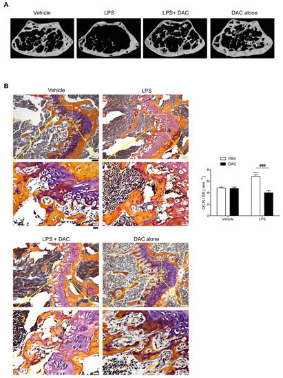 By contrast, co-treatment with DAC prevented LPS-induced bone loss (Figure 1B, Table 1). The injection of DAC with LPS enhanced the BMD, BV/TV, and Tb. Th., and diminished the enlargement of Tb. Sp. more than LPS alone (Table 1), but DAC alone did not exhibit any significant differences compared with the vehicle control (Figure 1B, Table 1). As shown in Figure 1B, OC.N./BS (the ratio of the OC number to total bone surface area) as analyzed by in vivo TRAP staining was also significantly reduced by the injection of DAC into LPS-treated mice.