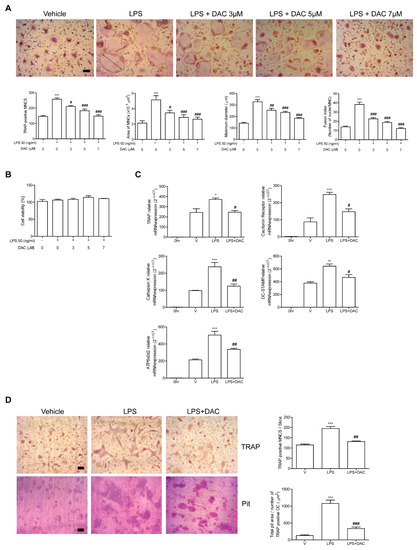 Next, the effect of DAC on in vitro bone resorption activity of DAC after LPS stimulation was assessed using dentine slices. Generated mature OCs were incubated with or without DAC in the presence of LPS on the bone. The addition of DAC significantly reduced the total pit area/number of OCs in the LPS-treated cells (Figure 2D), implying that OC activity was affected by DAC.