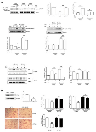 Since the inhibitory effect of DAC on OC formation was completely eliminated by both NF-κB inhibition and decreasing the ROS level, we suspected that both pathways were linked to the mechanism DAC uses to inhibit OC formation. Then, we wondered whether the decreased ROS due to DAC affected NF-κB signaling pathways by reducing the target molecules, thus blocking NF-κB activation. Since recent studies have reported that the inhibition of serine/threonine-protein phosphatase 2A (PP2A) results in the activation of the IKKα/IκBα/NF-κB pathway [26] and PP2A inactivation is mediated via LPS-induced ROS [27], we hypothesized that LPS-induced ROS may oxidize PP2A for inactivation, leading to NF-κB activation.