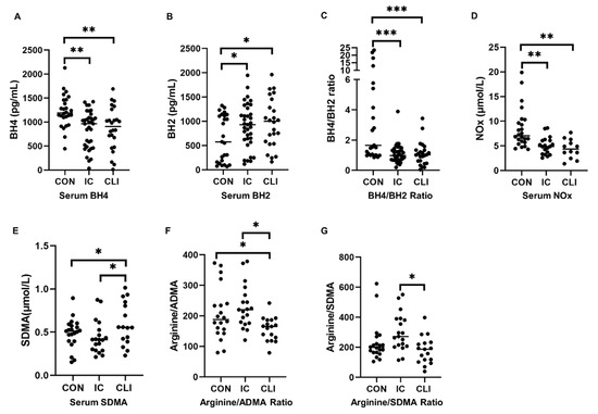 Levels of nitric oxides (NOx) and regulators of nitric oxide (NO) synthesis. The concentrations of these compounds were measured in the sera of patients with intermittent claudication (IC), critical limb ischemia (CLI), and non-peripheral artery disease (PAD) controls. (A), tetrahydriopterin (BH4) concentrations; (B), dihydrobiopterin (BH2) concentrations; (C), the ratio of BH4/BH2; (D), NOx concentrations; (E), symmetric dimethylarginine (SDMA) concentrations; (F), the ratio of arginine/asymmetric dimethylarginine (ADMA); (G), the ratio of arginine/SDMA. Bars indicate median, and p values were calculated by analysis of covariance (ANCOVA) test. * represents p < 0.05, ** represents p < 0.01, *** represents p < 0.0001.