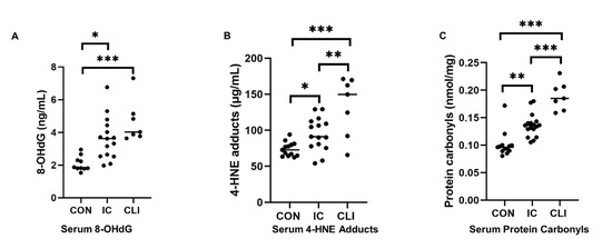 Levels of oxidative stress markers. Levels of markers of DNA, lipid, and protein oxidation were measured in the sera of patients with intermittent claudication (IC), critical limb ischemia (CLI), and non-PAD controls. (A), levels of 8-Oxo-2′-deoxyguanosine (8-OHdG); (B), levels of 4-hydroxynonenal (4-HNE); (C), levels of protein carbonyls. Bars indicate median, and p values were calculated by ANCOVA test. * represents p < 0.05, ** represents p < 0.01, *** represents p < 0.0001.
