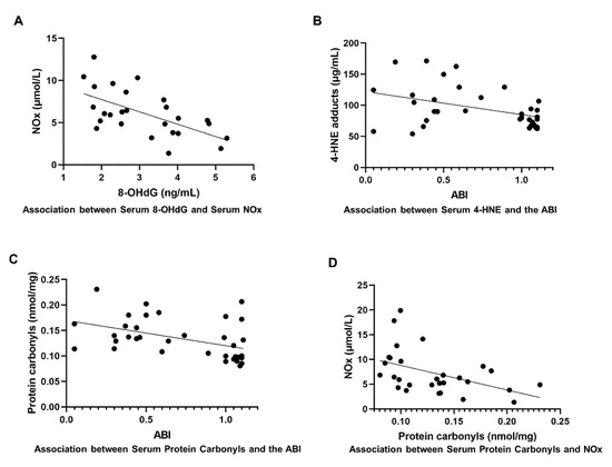 Associations between oxidative stress markers with nitric oxides (NOx) and ankle-brachial index (ABI). A Pearson correlation was calculated to test the association between variables. (A), There was a significant association between 8-OHdG and NOx levels (r = −0.602, p = 0.001); (B), 4-hydroxynonenal (4-HNE) levels and the ABI (r = −0.409, p = 0.015); (C), protein carbonyl levels and the ABI (r = −0.439, p = 0.007); and (D), protein carbonyl and NOx levels (r = −0.457, p = 0.013).