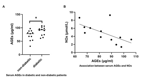 Serum advanced glycation end product (AGE) levels. (A), an independent sample t-test was used to test the difference between AGE levels in non-diabetic and diabetic patients. There was a significant difference in serum AGEs between non-diabetic and diabetic patients (p = 0.039). Bars indicate median, * represents p < 0.05. (B), A Pearson correlation was calculated to test the association between serum AGEs and serum NOx. There was a significant association between AGE levels and NOx (r = −0.62, p = 0.03).