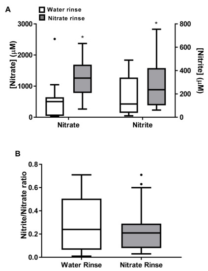 Participants were instructed to hold 10 mL of water in their mouth for 2 min, and the process was repeated with 10 mL of a solution of 8 mM sodium nitrate. The mouth rinse was collected into a sterile tube and centrifuged (4500 rpm, 4 °C) for 10 min. The supernatant was collected and stored at −80 °C before the measurement of nitrite and nitrate concentration as indicated below.
