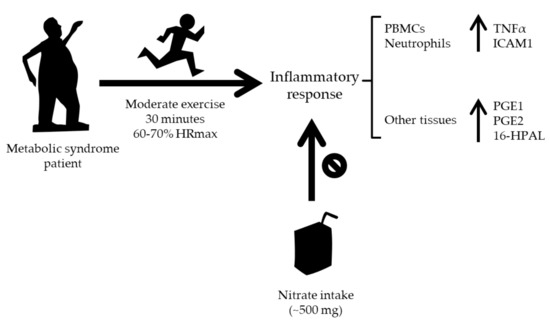 Aerobic exercise of moderate intensity and duration (30 min at 60–70% maximal heart rate) produced a mild systemic pro-inflammatory environment 30 min after exercise in metabolic syndrome patients, indicated by increased plasma concentration of the pro-inflammatory mediators TNFα and ICAM1, and also by an increased plasma concentration of the prostaglandins PGE1 and PGE2 and the newly detected hydroxyl saturated fatty acid 16-HPAL, probably reflecting an activated operation of enzymes involved in inflammation processes such as COXs and CYP450. PBMCs and neutrophils could be responsible for the basal plasma concentration of TNFα and IL6 but not for the plasma concentration of oxylipins, thus indicating that the changes induced by exercise in the plasma concentration of pro-inflammatory molecules and oxylipins are due to production by other tissues, such as contracting muscle. Intake of sodium nitrate 30 min before exercise increased the concentration of nitrate and nitrite in the oral cavity and plasma, reduced the oxygen cost of exercise, prevented the enhancing effects of acute exercise on pro-inflammatory mediators production and on PGs and other oxylipin plasma concentration, and reduced the capabilities of PBMCs and neutrophils to produce oxylipins. The main findings of this research are summarized in Figure 3. A practical application resulting from the present study could be the recommendation to ingest nitrate-rich foods or nitrate-enriched beverages before practicing exercise, which could contribute to the attenuation of the inflammatory response associated to exercise in patients with metabolic syndrome.