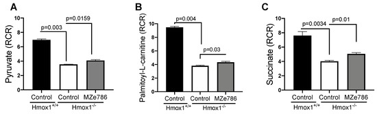 Loss of HO-1 disturb the cardiac mitochondrial respiration. Mitochondrial oxygen consumption was measured in isolated cardiac mitochondria from Hmox1+/+ and Hmox1−/− mice exposed to MZe786 via gavage. The respiratory control ratio (RCR) (state 3/state 4o) was calculated using complex I-driven substrates: (A) pyruvate and (B) palmitoyl-L-carnitine. (C) RCR was calculated in complex II-stimulated cardiac mitochondria using succinate as substrate. Values are expressed as means ± SEM. N = 4.