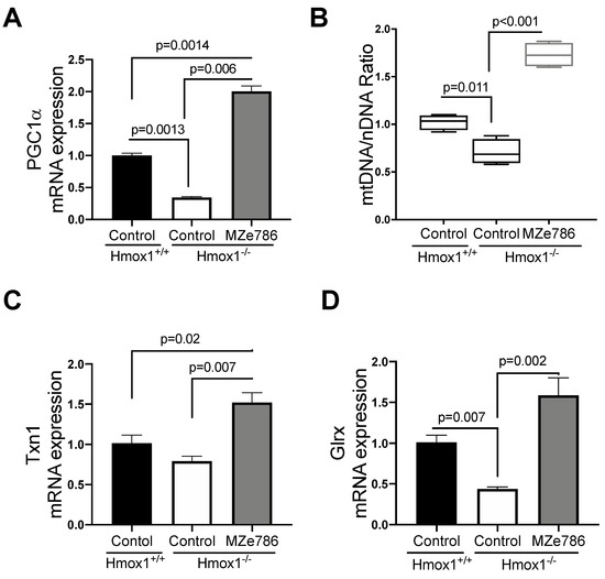 Once we established that the loss of HO-1 leads to signs of mitochondrial dysfunction in the heart, we sought to evaluate the role of MZe786 in the restoration of the cardiac mitochondrial function. As previously reported, peroxisome proliferator-activated receptor gamma coactivator 1-alpha (PGC1-α) plays a key role in cardiac metabolism by enhancing the mitochondrial biogenesis signal [53,54] and promoting the antioxidant defense system [55] in the heart. Therefore, we evaluated the gene expression of PGC1-α and the content of mitochondria expressed as the ratio of mitochondrial DNA by nuclear DNA (mtDNA/nDNA) in our model.