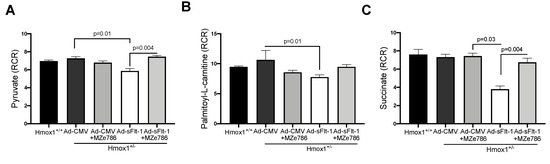 To evaluate the capacity of Hmox1+/− cardiac mitochondria for the oxidation of complex I substrates, we calculated the RCR in mitochondria exposed to pyruvate and palmitoyl-L-carnitine, respectively. The dose of Ad-sFlt-1 to administer was tested in-house. We observed that 0.5 × 109 PFU/mL of Ad-sFlt-1 increased sFlt-1 circulating protein levels without inducing any toxic effect in mice, as shown in Figure S3. Ad-sFlt-1 injected mice showed a significant reduction in the calculated RCR in response to pyruvate, when compared to control animals injected with Ad-CMV (p = 0.0159). In Ad-sFlt-1 mice treated with MZe786, we evidenced the significant restoration of the pyruvate-dependent RCR in comparison to the Ad-sFlt-1 injected mice (p = 0.0043). No significant difference was evidenced between the Ad-CMV and Ad-sFlt-1 + MZe786 treated mice (p = 0.9), as shown in Figure 3A. In contrast, the calculated RCR resulting from palmitoyl-L-carnitine oxidation showed that Ad-sFlt-1 reduce the ability for the oxidation of fatty acids via complex I in comparison to control animals; however, this was not statistically different (p = 0.19). MZe786 enhanced the respiratory efficiency in cardiac mitochondria from Ad-sFlt-1 in comparison to Ad-sFlt-1 counterparts (p = 0.01). No difference was evidenced when comparing Ad-CMV with Ad-sFlt-1 + MZe786 treated mice (p = 0.9), as shown in Figure 3B. Regarding the cardiac mitochondrial complex II-dependent oxidation of succinate, our results showed that sFlt-1 significantly reduced the calculated RCR in comparison to control mice (Ad-CMV) (p = 0.03). MZe786 improved the respiratory efficiency in Ad-sFlt-1 injected Hmox1+/− mice (p = 0.004) while no statistical difference was observed when compared to Ad-CMV (p = 0.9), as shown in Figure 3C. Furthermore, Ad-CMV, in the presence of MZe786, was similar to Ad-CMV alone, indicating that this drug causes no adverse effect, as shown in Figure 3. Oxygen consumption rates representative of state 3 and state 4o respiration were used to calculate the RCR, as shown in Figure S4. These observations suggest that environments of high sFlt-1 negatively regulate the cardiac mitochondrial activity in response to complex I substrate pyruvate and complex II substrate succinate in reduced HO-1 setting. Interestingly, the response to fatty acid substrate palmitoyl-L-carnitine was not impaired in cardiac mitochondria from Ad-sFlt-1 injected Hmox1+/−, suggesting that the fatty acid-driven mitochondrial function might play a key role in sustaining the energetic demands in Hmox1+/− hearts. Therefore, events dysregulating this metabolic pathway might lead to mitochondrial dysfunction in environments of reduced HO-1.