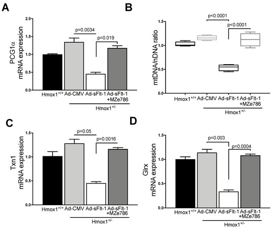 Finally, we observed that cardiac tissue from Ad-sFlt-1-injected Hmox1+/− mice showed the reduced transcription of antioxidant genes Txn1 and Glrx (p = 0.05 and p = 0.003, respectively) when compared to their wild type counterparts. The administration of MZe786 significantly stimulated Txn1 and Glrx gene expression in the hearts from Ad-sFlt-1-injected Hmox1+/− mice (p = 0.0016 and p = 0.0004, respectively). No statistical difference between Txn1 and Glrx gene expression was observed when compared to Ad-CMV (p = 0.55 and p = 0.21, respectively), as shown in Figure 4C,D. These observations suggest that MZe786 enhances the transcription of cardiac antioxidant genes in response to high sFlt-1 and low HO-1 milieu.