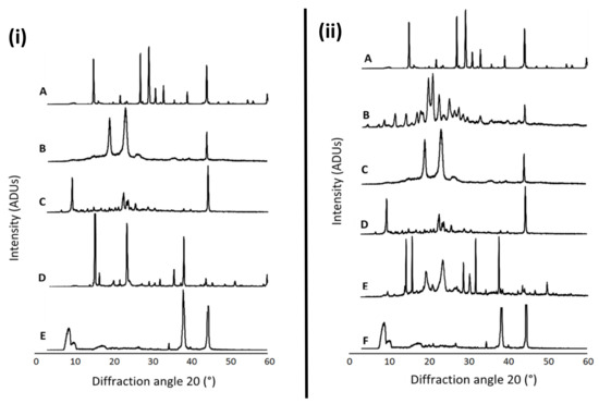 (i) P68 + DQA NAC. XRD patterns of (A) NAC, (B) P68, (C) DQA, (D) a physical mixture of P68, DQA and NAC in the same ratio as the nanoformulation and (E) lyophilized P68 + DQA NAC nanoformulation. (ii) P68 + DQA NAC + DFO. XRD patterns of (A) NAC, (B) DFO, (C) P68, (D) DQA, (E) a physical mixture of P68, DQA, NAC and DFO in the same ratio as the nanoformulation and (F) lyophilized P68 + DQA NAC + DFO nanoformulation.