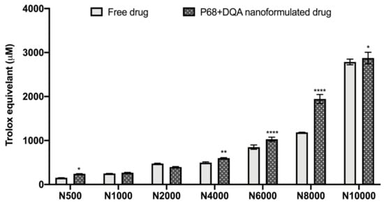 The antioxidant capacity of the NAC (500–10,000 μM)-associated P68 + DQA nanocarriers was assessed using the FRAP assay, and compared to the corresponding free drug at each concentration (Figure 2). Significant differences in mean Trolox equivalent antioxidant capacity were observed between the different concentrations of treatments (F(6, 70) = 4088, p < 0.0001,) and between the different free or formulated treatment preparations (F(1, 70) = 219.3, p < 0.0001) (Figure 2). All concentrations of the P68 + DQA NAC nanocarriers had at least the same antioxidant capacity as the corresponding free-drug concentrations of NAC (Figure 2). The 500 μM (p = 0.0222), 4000 μM (p = 0.0055), 6000 μM (p < 0.0001), 8000 μM (p < 0.0001) and 10,000 μM (p = 0.0257) concentrations of P68 + DQA NAC exhibited higher antioxidant capacity than free NAC at these concentrations, between 3.19 and 64.15% (Figure 2).