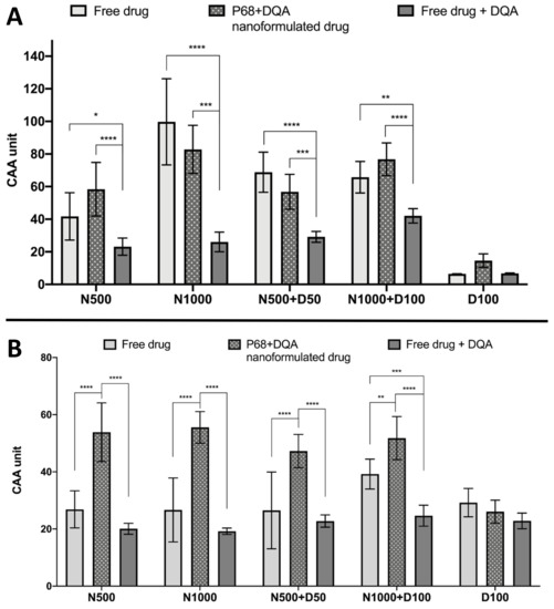 (A). Cellular antioxidant activity (CAA) assay results for free-drug, P68 + DQA nanformulated drug and free drug + DQA preparations of 50 or 1000 μM NAC (N500, N1000), combined NAC and 50 or 100 μM DFO (N500 + D50, N1000 + D100) and 100 μM DFO alone (D100) when using 100 μM rotenone as the prooxidant (mean ± S.D., n = 6). (B). Corresponding CAA results when using 600 μM ABAP as the prooxidant. * represent significance when comparing the P68 + DQA nanoformulated drug to the free-drug and free drug + DQA preparations within the same drug condition (**** p < 0.0001, *** p < 0.001, ** p < 0.01, * p < 0.05).
