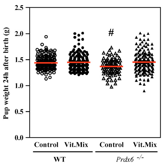 Pup weight at 24 h after birth. Each circle or triangle corresponds to one litter from WT or Prdx6−/− males, respectively. Open symbols correspond to males fed with the control diet, and black symbols correspond to males fed with the Vit. Mix diet. The mjedian of each group is represented by a horizontal red line. # means smaller than all the other groups (p ≤ 0.05, two-way ANOVA and Tukey tests).