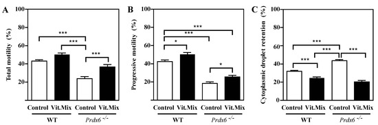 Motility and epididymal maturation of spermatozoa from WT or Prdx6−/− males fed with the control (open bars) and Vit. Mix (black bars) diets, respectively. Total (A) and progressive (B) motility and (C) cytoplasmic droplet retention, a marker of immature spermatozoa. * p ≤ 0.05; *** p ≤ 0.001, two-way ANOVA and Tukey tests.