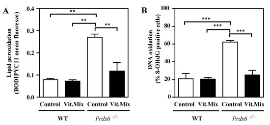Lipid peroxidation (A) and DNA oxidation (B) in spermatozoa from WT or Prdx6−/− males fed with control (open bars) and Vit. Mix (black bars) diets, respectively. (A) Lipid peroxidation measured by flow cytometry using a BODIPYC11 fluorescent probe. (B) DNA oxidation determined by the levels of 8-hydroxy-2’-deoxyguanosine (8-OHdG) in spermatozoa according to immunocytochemistry. ** p ≤ 0.01; *** p ≤ 0.001, two-way ANOVA and Tukey tests.