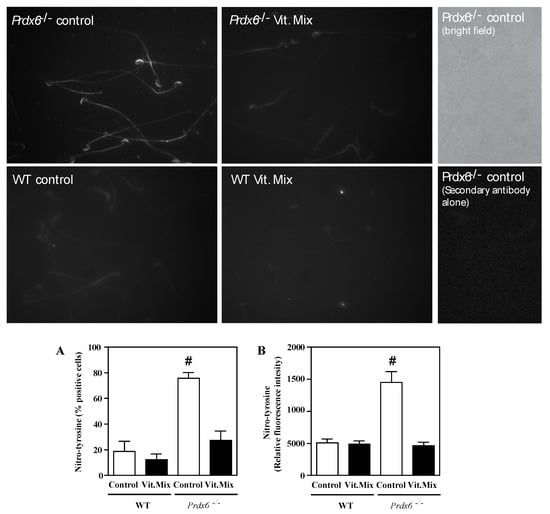 We determined the levels of tyrosine nitration in spermatozoa from WT and Prdx6−/− males fed with the control and Vit. Mix diets by immunocytochemistry, as previously performed, with modifications [27]. After thawing, spermatozoa were smeared onto slides and allowed to dry. Then, the cells were permeabilized with 100% methanol at −20 °C, rehydrated with PBS-T and blocked with 5% goat serum for 30 min at room temperature. The sperm smears were washed again with PBS-T and incubated overnight at 4 °C with the anti-nitro-tyrosine antibody (catalog # ab61392, Abcam Inc, Toronto, ON, Canada) at a 1:100 dilution. Fluorescent signals were analyzed under an epifluorescence microscope (Zeiss Axiophot, Germany). All the images were captured with a digital camera (Retiga1300, QImaging, Burnaby, BC, Canada) with the same time exposure and digitized with the Northern Eclipse digital imaging software, version 6.0 (Empix Imaging, Mississauga, ON, Canada). The results are expressed as the percentages of spermatozoa with positive signals and as the relative fluorescence intensity (RFI). To determine the RFI, digitized grayscale pictures were analyzed with the Image J software V1.42q (National Institutes of Health, Bethesda, MD, USA). The mean gray value of the background was subtracted from the values measured in the spermatozoa. The results are expressed as relative units of RFI. At least 200 spermatozoa were counted per sample.