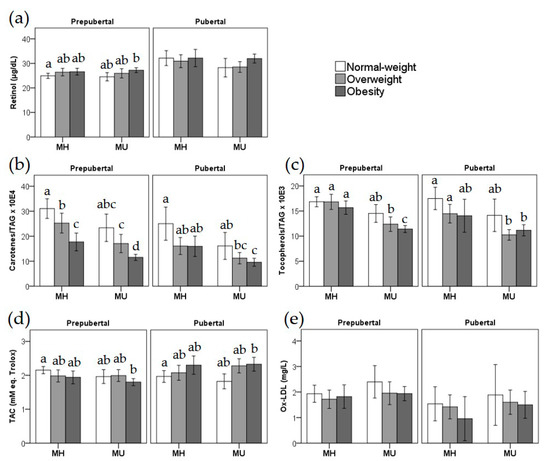 Mean values of plasma retinol (a), carotenes/TAG (b), tocopherols/TAG (c), TAC (d), and ox-LDL (e) of prepubertal and pubertal children, according to their weight categories (normal-weight, overweight, and obesity) and metabolic health (healthy or unhealthy) status. Within each pubertal category, different letters indicate significant differences at p < 0.05 in pairwise comparisons of the general linear model adjusted for sex, age and recruitment center, (sharing the same letters indicates no significant differences between groups, absence of letters indicates no significant differences between any of the groups). MH: metabolically healthy; MU: metabolically unhealthy; ox-LDL: oxidized low-density lipoprotein; TAC: total antioxidant capacity; TAG: triacylglycerols.
