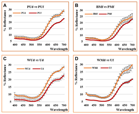 Reflectance curves of some selected homogenates: (A) comparison between PUd and PUf; (B) comparison between BMf and PMf; (C) comparison between WUd and Ud; (D) comparison between WMd and Uf. Each reported profile represents the mean of four measurements.