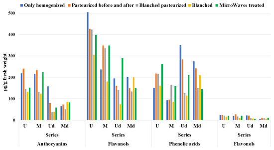 In particular, it seems that the different type of homogenization (domestic mixer or Ultraturrax®) does not affect the anthocyanin and flavonol content as much as the content of flavanols and phenolic acids, which account for an average loss of 35% in series f treated with domestic mixer, much less marked in thawed samples (about 4.5%). The hydroxycinnamic and flavonoid contents are influenced by the different carried out thermal treatments, although to a less drastic extent if compared to anthocyanins, indicating that these last pigments are much more sensitive, particularly to the thawing.