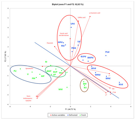 The most significant variables to discriminate between fresh and defrosted samples are represented by phenolic acids content, which is higher in the defrosted samples, whereas flavonoids are more represented in the fresh ones. The CIEL*a*b* parameters seem to contribute less. Considering the different analyzed variables (Figure 4), a clear separation between fresh (green) and defrosted (blue) samples could be revealed. Moreover, in both series, a separation into different groups could be underlined.
