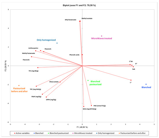 This could be better explained by Figure S4 (in Supplementary Materials) and in Figure 5, in which the effect of different treatments is compared within the fresh sample series. The pasteurized samples represent the most interesting ones in terms of TPC, TFC, antioxidant and antiradical effects with respect to the corresponding homogenates samples. Both the blanching and microwave treatment induce a relevant impact in quality parameters, while the pasteurization performed immediately after blanching (green samples) seems to preserve from modification induced by the blanching process.