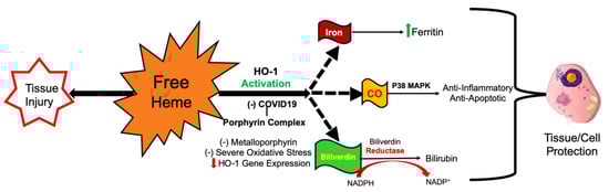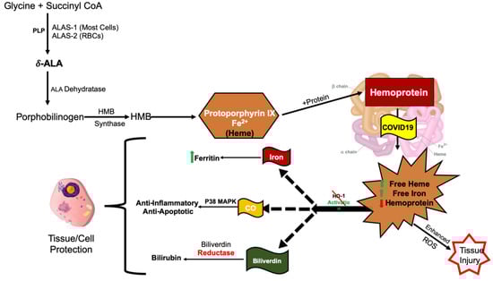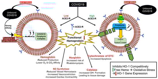 COVID-19 produces a severe systemic inflammatory reaction, likely the result of increased free heme levels and decreased levels of HO-1 activity and functional hemoprotein. The spike protein of COVID-19 binds ACE-2 receptors (Figure 1) and porphyrin molecules with weak and strong affinity, respectively []. Porphyrins are the building blocks of heme and allow COVID-19 access to invade cells along with ACE-2 receptors and bind functional hemoprotein within the cell []. The resulting COVID-porphyrin complex may lead to an impairment of HO-1 function and an upregulation of pro-inflammatory free heme and iron, which overwhelms the anti-inflammatory cytoprotection of HO-1 [].