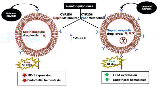 Patients with genetic polymorphisms of the CYP2D6 and the HO-1 GT allele make treatment and prognosis challenging. Carriers of these different polymorphisms will respond well to medications and have less risk of developing complications from COVID-19 such as ARDS and multiorgan failure, while others will develop toxic drug levels and multiorgan failure [] (Figure 4). This may explain the unpredictability clinicians are observing with COVID-19 patients and variable results regarding 4-aminoquinolones. More recent data suggests that 4-aminoquinolones showed no benefit over the standard of care and patients were at higher risk of developing cardiac arrest in the treatment group, especially when combined with Azithromycin [,].