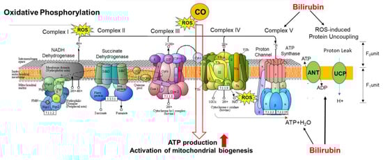 As ATPase activity increases, more electrons and protons permeate through the mitochondrial membrane into the matrix, leading to the formation of ROS. Molecules such as uncoupling proteins (UCPs), and adenine nucleotide translocases (ANTs) uncouple these reactions counteracting ATPase’s increased activity lowering the formation of ROS with increased thermogenesis. Furthermore, the ROS formed by COVID-19′s “cytokine storm” create inflammation that is destructive to the mitochondria in the electron transport chain (ETC). If insufficient mitochondria in cells is evident, such as in white adipose cells, these cells are unable to accommodate the severe ROS formed leading to overwhelming inflammation. Brown adipose cells are better at handling ROS due to higher concentrations of mitochondria. CO increases ATP production and activates mitochondrial biogenesis [,,] and bilirubin blocks ROS action and increases resistance to hepatic steatosis. [,].
