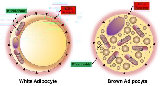 ACE-2 is overexpressed in adipose tissue in obesity and diabetes allowing COVID-19 to infect the cell. Lean (brown adipocyte) tissue is characterized by high amounts of mitochondria and HO-1 levels which result in low levels of ROS. Brown adipose tissue is better than white adipose tissue in its ability to handle the inflammation cause by COVID-19. Obese (white adipocyte) tissue is characterized by low amounts of mitochondria and HO-1, which results in high levels of ROS and upregulation of ACE-2 receptors, especially in morbid obesity and diabetes. COVID-19 patients with high amounts of white adipose tissue develop severe inflammation.