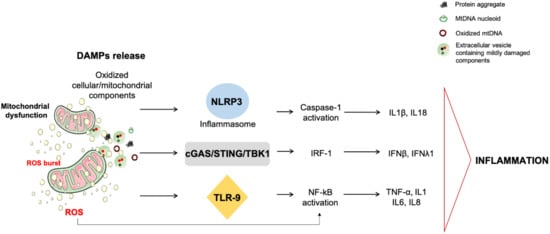 - Grazioli, S.; Pugin, J. Mitochondrial damage-associated molecular patterns: From inflammatory signaling to human diseases. Front. Immunol. 2018, 9, 832. [Google Scholar] [CrossRef]