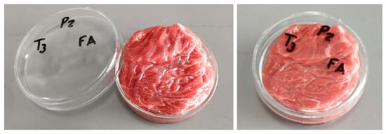 From commercial beef chuck eye, a mass of approximately 20 g of meat was cut, wrapped with a film sample, and introduced on a glass Petri dish that was closed with its lid (Figure 1). For each day of analysis, a triplicate was prepared for each type of film. The samples were stored at a constant temperature of 4 °C in a refrigerated chamber without light. Analyses were performed at four time points—on day 0 and after two, three and five days of storage. Control samples were also stored at the above conditions without the presence of any film.