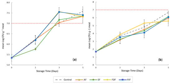 Effect on microbial load of alginate film and alginate film with microparticles and pineapple peel powder during five days of storage of meat at 4 °C. (a) Total aerobic mesophilic bacteria and (b) Pseudomonas spp. Alginate film with microparticles with encapsulated hydroalcoholic extract (EF), alginate film with pineapple-peel-juice microparticles (PJF), alginate film with freeze-dried peel powder (FDF), and control films only with alginate (AF).