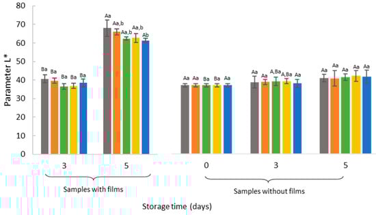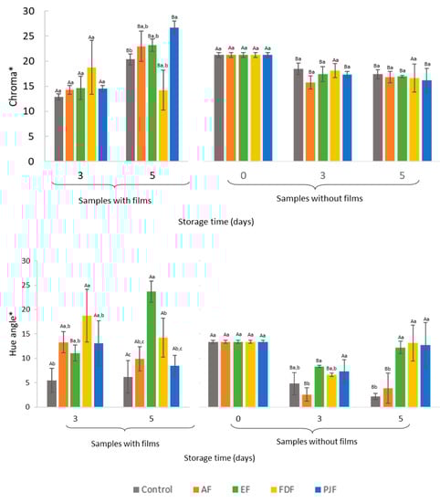 Color parameters of the samples with or without films after five days of storage at the refrigerated conditions. Different lowercase letters represent a statistically significant difference among results for the same storage time (p < 0.05). Different capital letters represent statistically significant parameter values of the same sample over the storage period (p < 0.05). Alginate film with microparticles with encapsulated hydroalcoholic extract (EF), alginate film with pineapple-peel-juice microparticles (PJF), alginate film with freeze-dried peel powder (FDF), and control films only with alginate (AF).